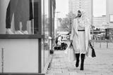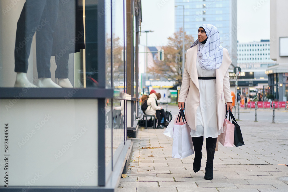 Young stylish Arabic woman in hijab dreamily walking around street with shopping bags
