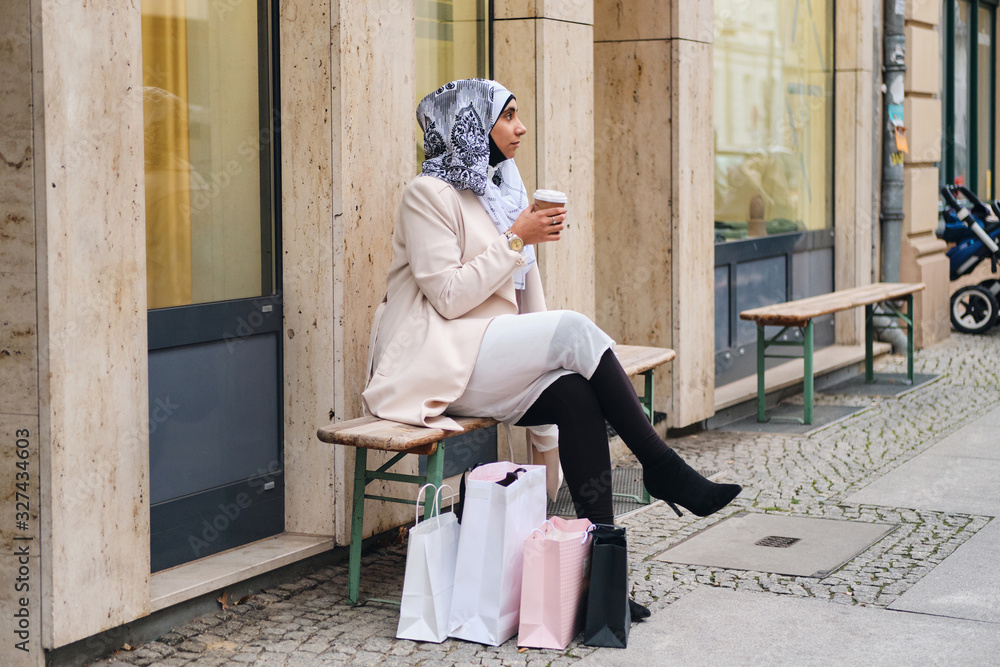 Young stylish Arabic woman in hijab drinking coffee on bench on city after shopping