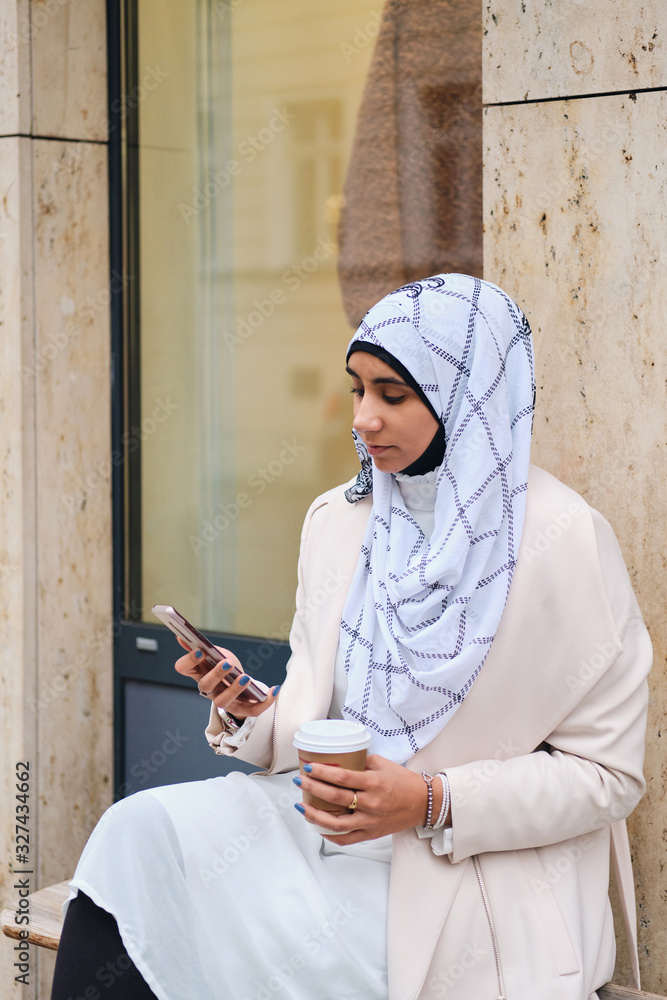 Young attractive Arabic woman in hijab using smartphone while sitting on city street with coffee to go