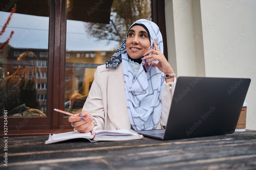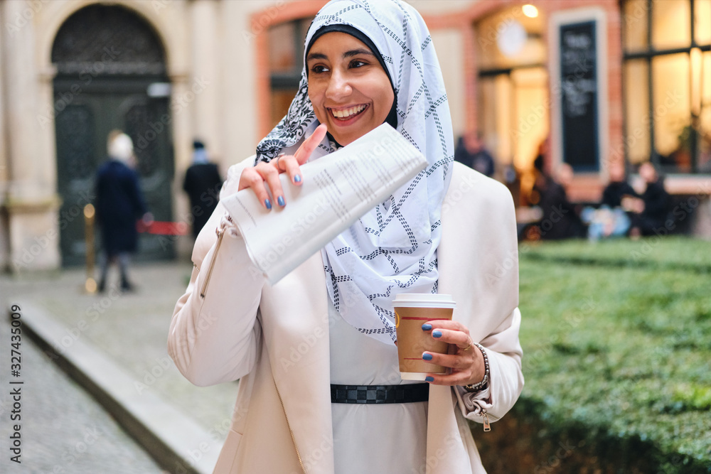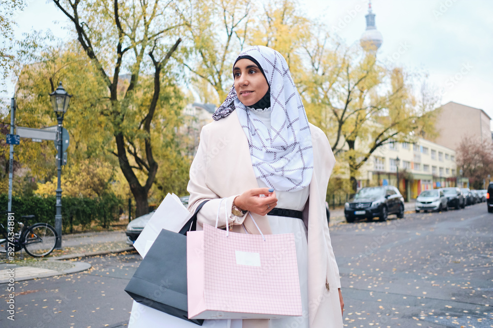 Young attractive Arabic woman in hijab dreamily walking with shopping bags on street