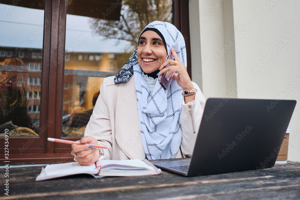 Young smiling Arabic woman in hijab happily talking on smartphone while working on laptop on street