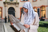 Young stylish Arabic woman in hijab intently reading newspaper on street