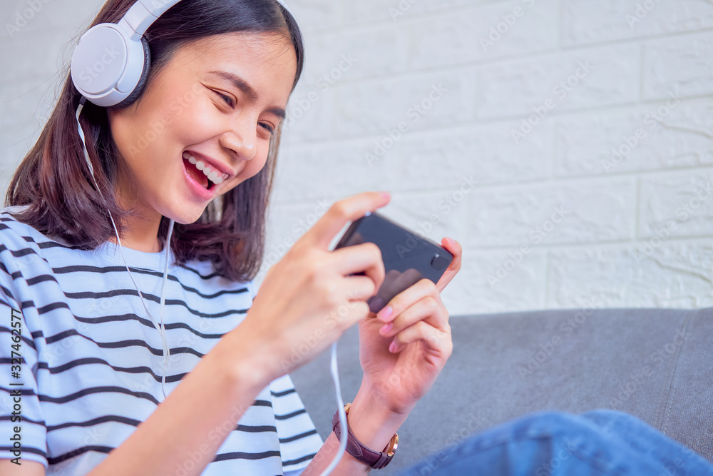 Excited young Asian woman sitting on sofa wear white headphone on the head and playing games on smartphone in the living room at home.