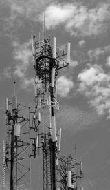 Telecommunication tower with blue sky and white clouds background. Antenna on blue sky. Radio and satellite pole. Communication technology. Telecommunication industry. Mobile or telecom 4g network.