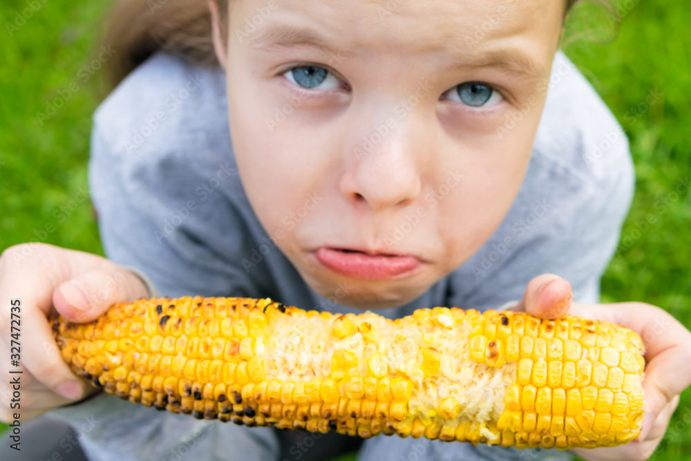 offended girl outdoors sits on grass and eats grilled corncob