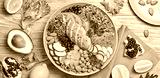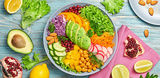 Buddha bowl salad with avocado, tomato, lettuce, cucumber, red cabbage, chickpeas, pomegranate. Paleo diet, healthy vegan and balanced food concept. Fresh rainbow mix green salad on wood, flat lay