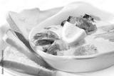 cream soup with prawn,scallops and mushrooms,isolated on white