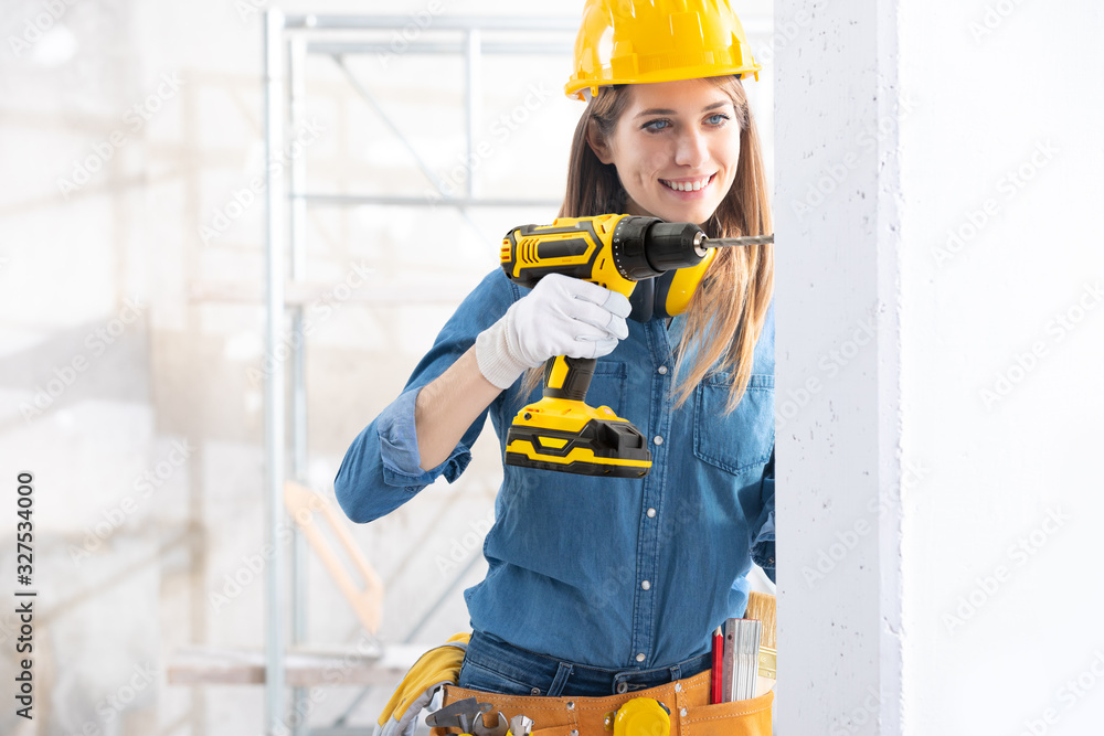 Attractive Female Builder drilling a hole