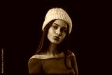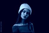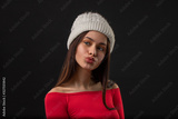 Portrait of beautiful young European woman keeps lips rounded, wears warm winter hat, poses over black background. Cold weather concept