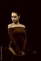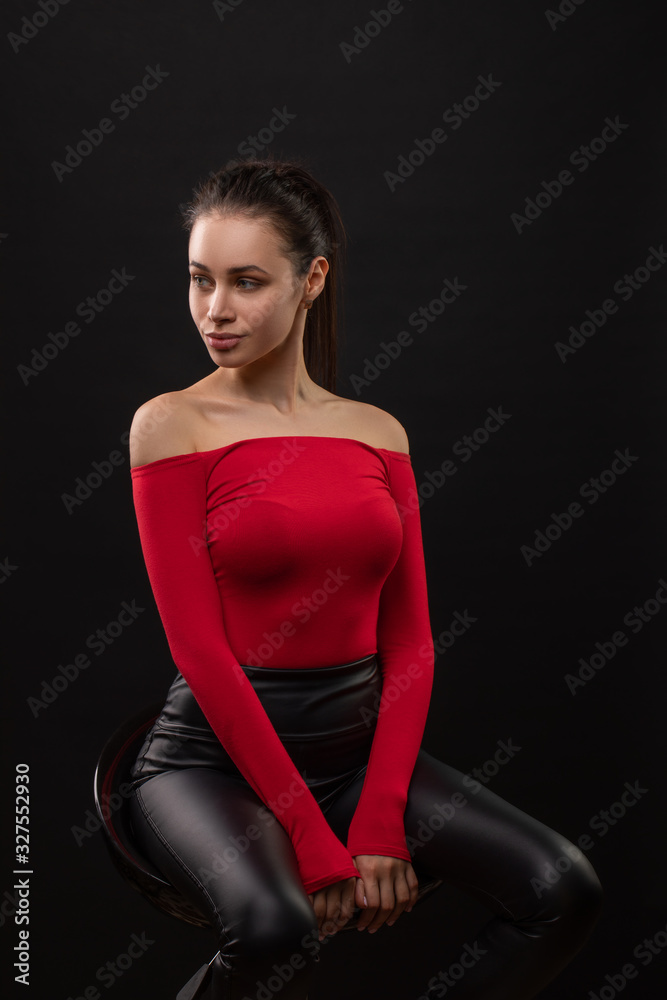 Vertical dramatic portrait with sensual brunette woman in red top with bared shoulders posing sitting on chair in the dark room. Full height.