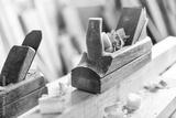 The carpenters using old spokeshave or plane to decorate the woodboard.