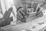 The carpenters using old spokeshave or plane to decorate the woodboard.
