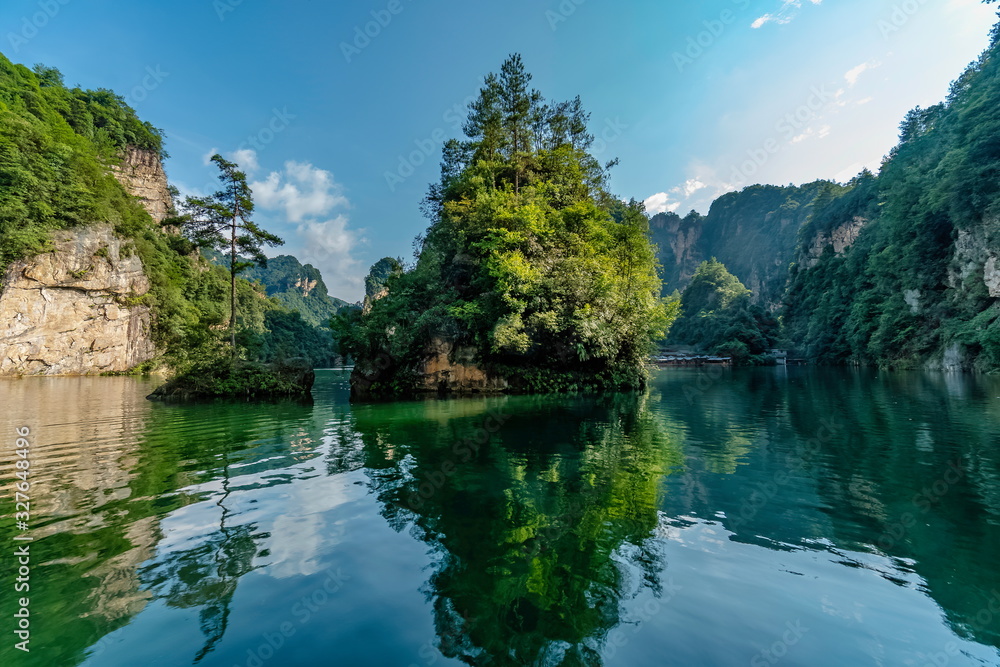 Small island covered with vegetation in the center of a lake with green waters and rugged mountains in the background. Baofeng Lake (Bao Feng Hu) in Suoxi Valley, Wulingyuan, China