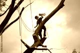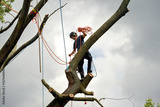 Arborist Cowboy. Professional climber on elm tree rigging ropes and removal equipment.
