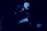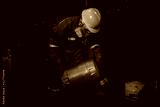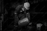 A Worker industry wearing safety uniform ,black gloves and gas mask under checking chemical tank in industry factory work