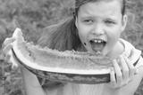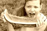 happy girl with a dirty face eats a red ripe watermelon on the street