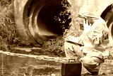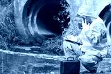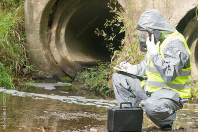 environmental specialist in a protective suit and mask talking on the phone and recording a work plan at the facility