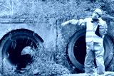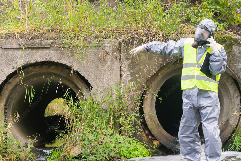 environmental laboratory specialist in protective suit and mask talking on the phone and pointing at emergency site