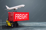 Yellow forklift carries red container and freight plane. International transportation logistics infrastructure, import export of goods products. Warehousing. Cargo transit. Air transportation