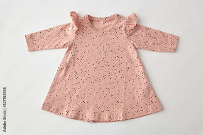 clothes, babyhood and clothing concept - pink dress for baby girl with dot print on white background