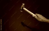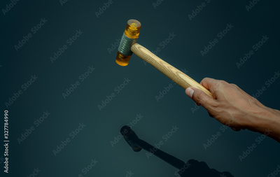 Man's hand holding plastic hammer isolated on dark background. Male worker's hand hold wood handle of plastic hammer. Hammer head made of soft and tough yellow plastic that not damage workpiece.