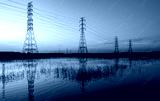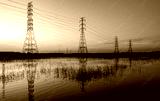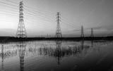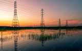 High voltage electric pylon and electrical wire with sunset sky. Electricity poles. Power and energy concept. High voltage grid tower with wire cable at rice farm field near industrial factory.