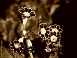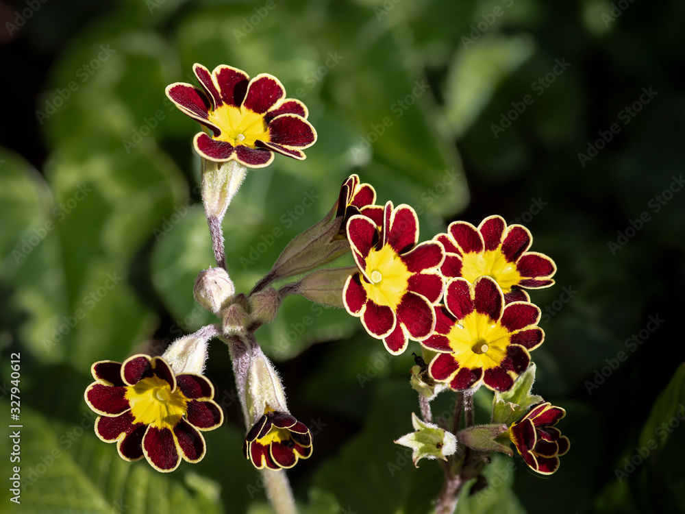 Dark red and yellow flowers of the Primula "Gold Lace" plant.