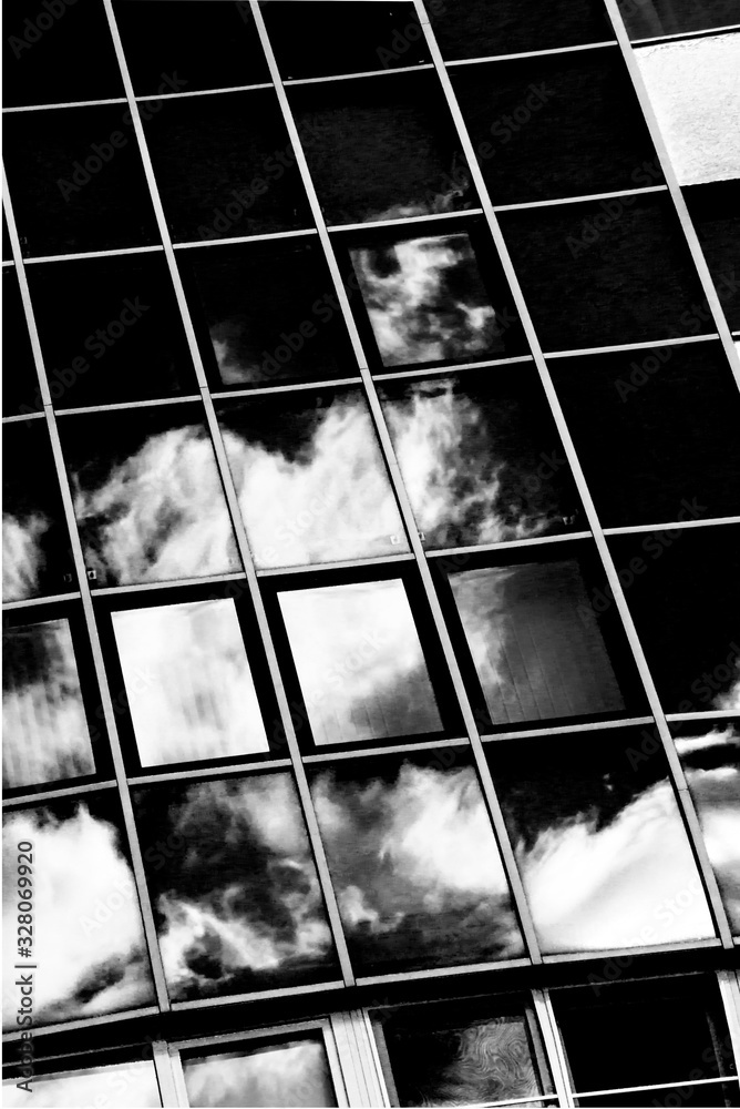 Clouds reflected in windows of modern office building. Skyscraper in the city . Black and white concept..