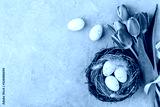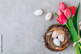 Easter eggs in the nest with pink tulips bouquet on gray stone background