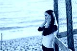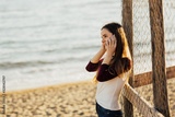 Beautiful young woman smiling on the mobile phone at the seaside of sea. She on the beach talking on the phone in sunny day.