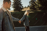 Couple on road in mountain. A couple in love, a man and a girl walk along the road to the distance, holding hands.