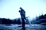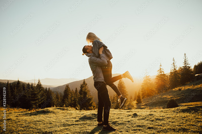 Enamored guy holding a girl in his arms, a frame at sunset. Couple enjoying sunset view from top of a mountain. Travel concept.