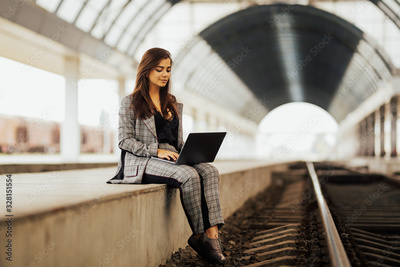 Successful female using laptop at train station. Charming beautiful woman travel to destination. She is a blogger and has to bring laptop going with her everywhere for working.