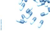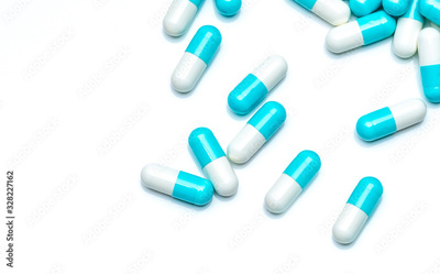 Blue-white capsule pills isolated on white background. Pharmaceutical industry and drugs market concept. Top view of blue pastel capsule pills spread on white table. Pharmacy products. Medication use.