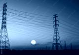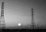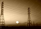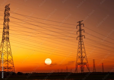 High voltage electric pylon and electrical wire with sunset sky. Electricity poles. Power and energy concept. High voltage grid tower with wire cable. Beautiful big sun at sunset with red-orange sky.