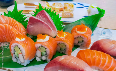 Japanese food combo set on white plate. Salmon sushi, sashimi, and nigiri on restaurant table. Fish meat sliced and Japan vinegared rice rolls with seafood and vegetables. Healthy Japanese food.