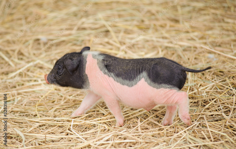 Cute pig bagy walking in farmyard