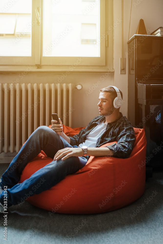 Young man listening to music with headphones and use your smartphone sitting on a pouf in her room - Millennial rests and fun at home
