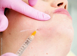 Beautician doctor with botulinum toxin syringe making injection to cheek. Cheek volume enhance mesotherapy. Anti-aging treatment and face lift in cosmetology clinic. Selective focus