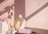 White Buddha bust on pastel pink background decorated with shades. Zero waste bamboo toothbrush. Spa asian style. Relax mood. Yoga background. Eco friendly