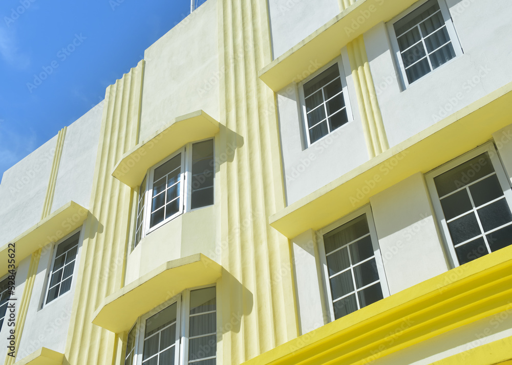 Miami Art Deco Architecture. Yellow and White Building Facade, Detail