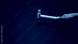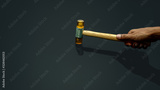 Man's hand holding plastic hammer isolated on dark background. Male worker's hand hold wood handle of plastic hammer. Hammer head made of soft and tough yellow plastic that not damage workpiece.