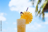 pineapple fresh on a background of sky and palm trees, tropical vacation