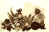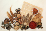 Chinese herb and spice collection used in traditional herbal medicine on bamboo mat and mottled cream background.