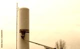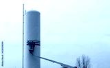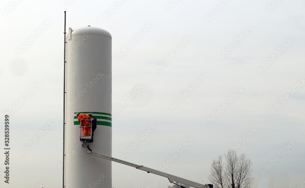 Two workers with colorful protective suits at work on a fuel silos. Gray winter sky on background.