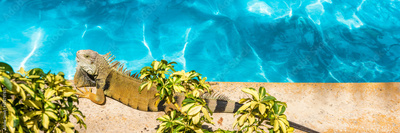 Funny iguana pet sunbathing by the swimming pool tanning poolside relaxing. Background for Caribbean summer travel vacation concepts.
