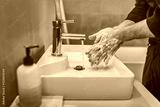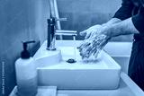 Washing hands with soap and hot water at home bathroom sink man cleansing hand hygiene for coronavirus outbreak prevention. Corona Virus pandemic protection by washing hands frequently.