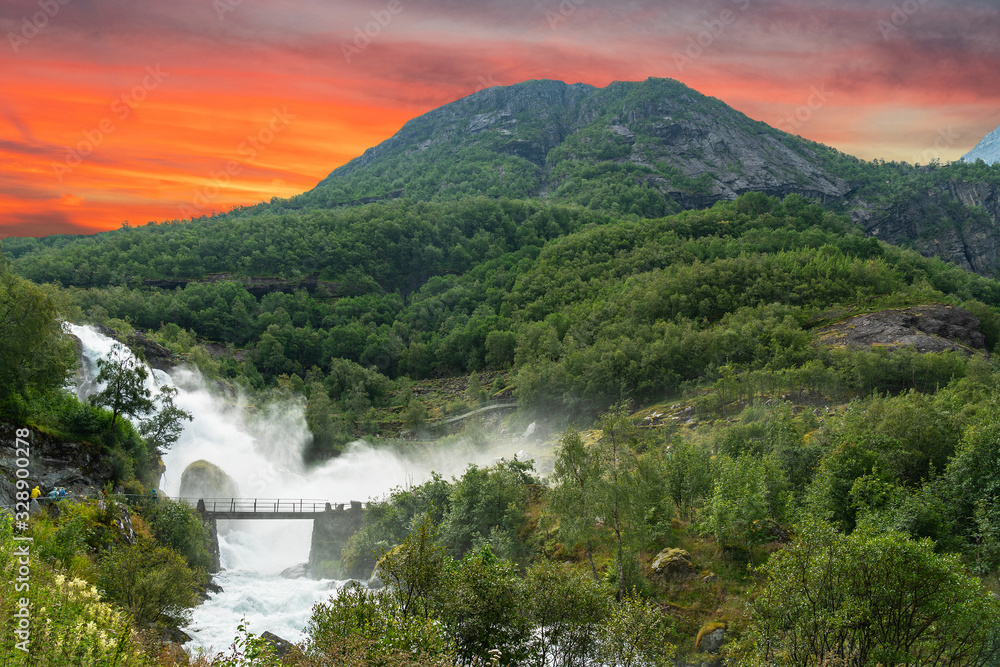 Waterfall near bridge, Norway, National park Jostedalsbreen, green mountain landscape