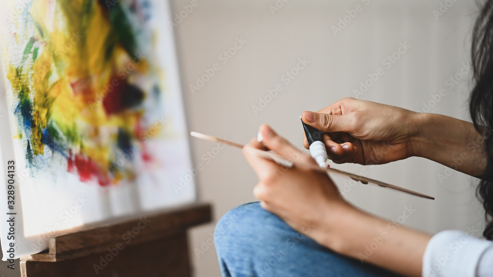Cropped image of beautiful woman artist's hands while mixing color on the wooden color palette while sitting in front the painting canvas with modern art studio as background.