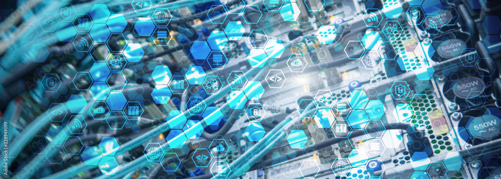 Blue Honeycomb Icons on Technology Management Center. Wifi Gears and Security concept. For your business.